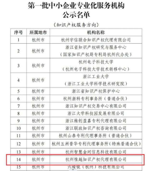 - 喜報!!關于杭州惟越知識產(chǎn)權(quán)代理有限公司入選浙江省首批中小企業(yè)專業(yè)化服務機構(gòu)的公示